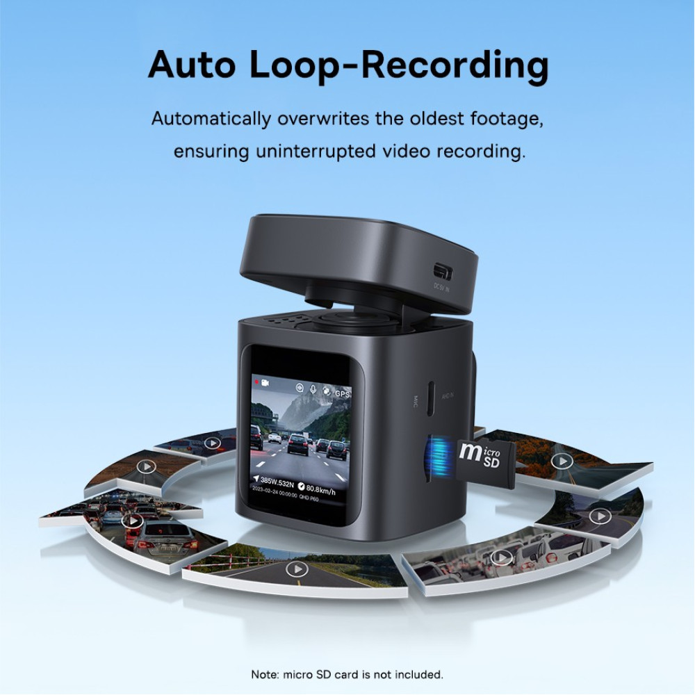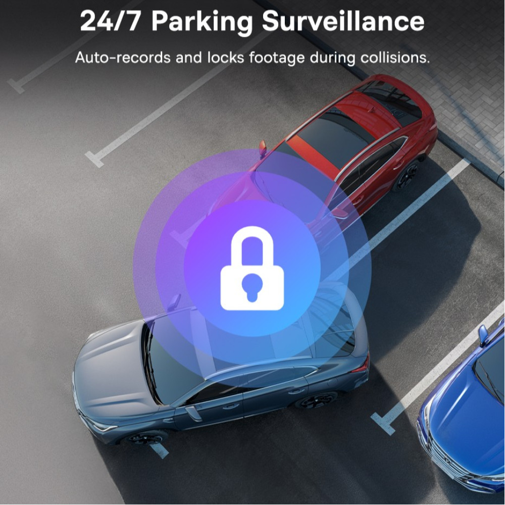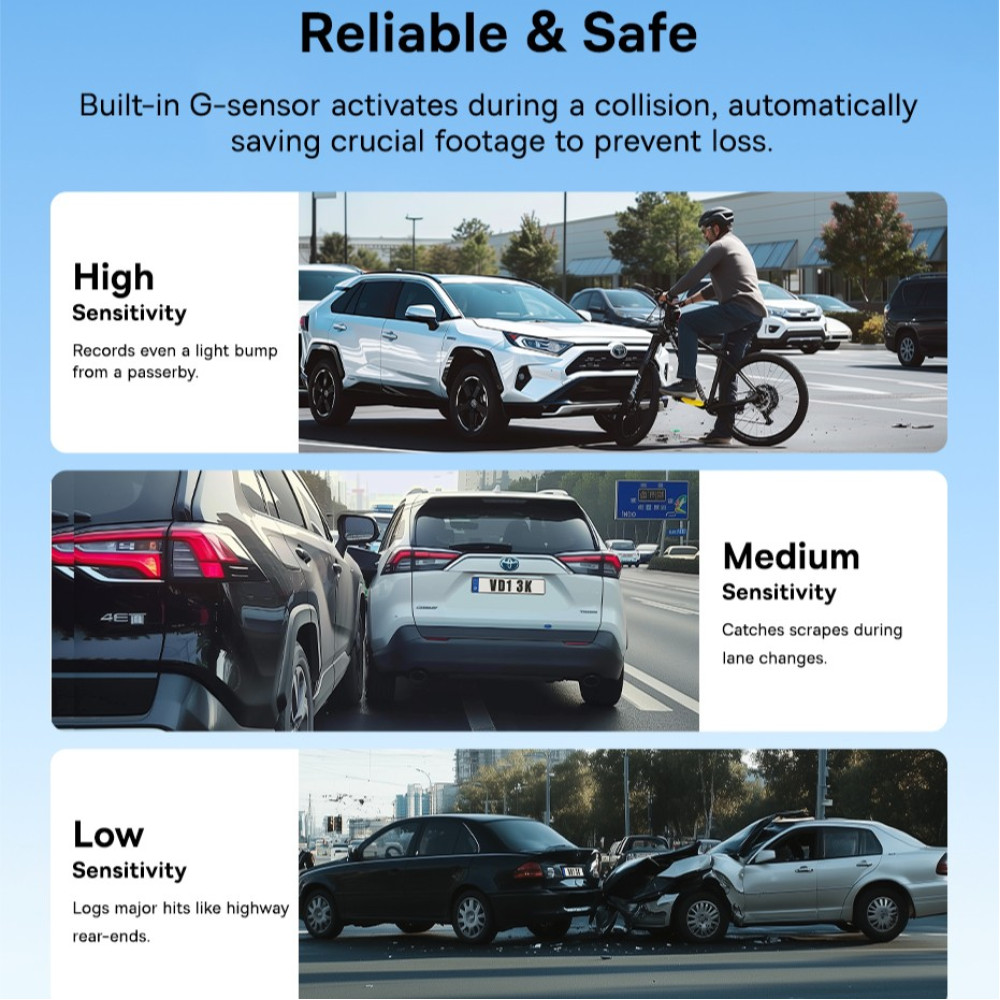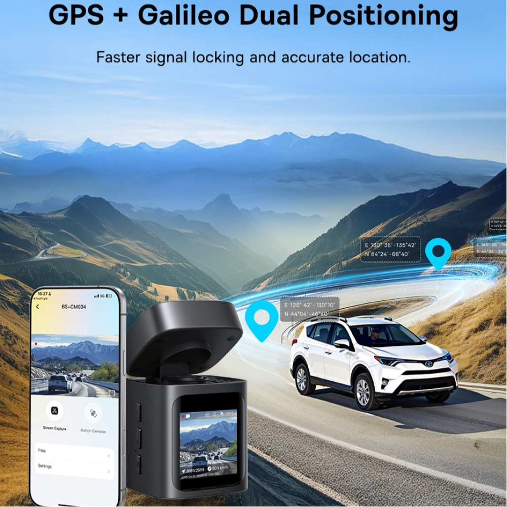Відстежує маршрут за допомогою двох супутникових систем (GPS + Galileo), реєструючи швидкість, час та місцезнаходження на кожному відео. Вбудований G-сенсор виявляє зіткнення та автоматично блокує відеозапис, щоб запобігти перезапису. Для цілодобового спостереження увімкніть систему безпеки паркування (за допомогою комплекту проводів) для моніторингу наїздів або зломів.