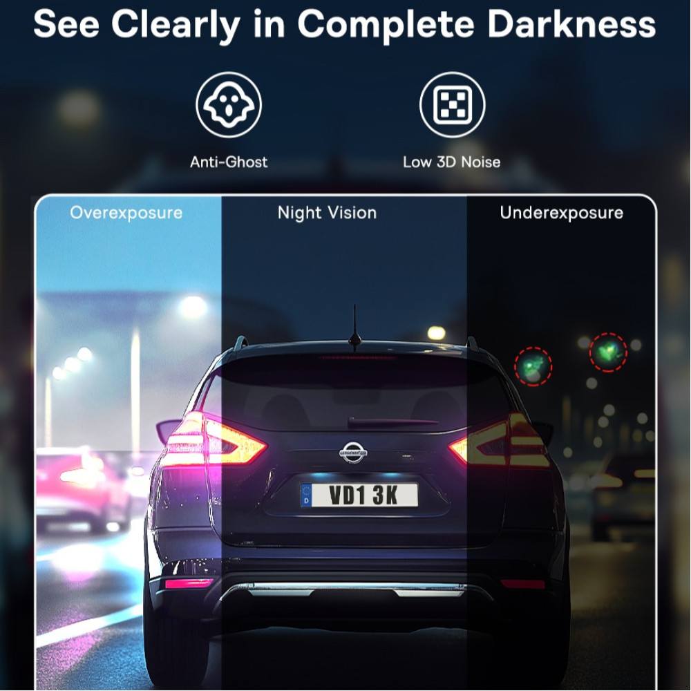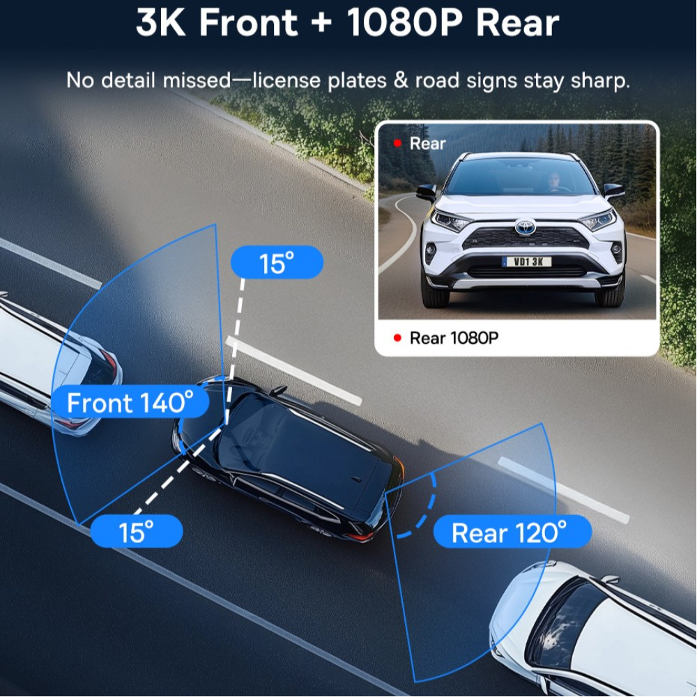 Ніколи не пропустіть жодної деталі на дорозі завдяки роздільній здатності 3K Ultra HD (2880x1620P), яка забезпечує втричі чіткіше відео, ніж стандартні відеореєстратори 1080P. Ширококутний об'єктив 140° з регульованим діапазоном 30° забезпечує широкий огляд смуг руху, дорожнього руху та критичного оточення.