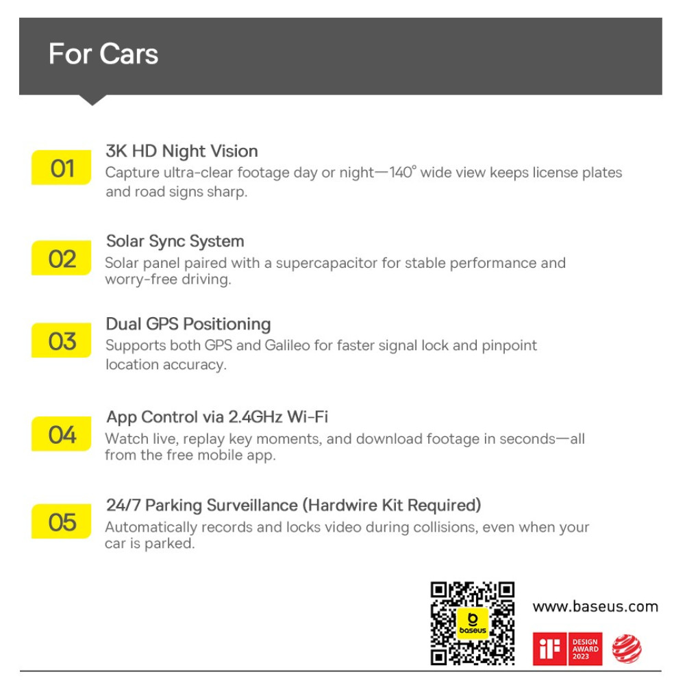 Підключіться через Wi-Fi 2,4 ГГц до безкоштовного додатка Baseus (iOS/Android) для перегляду в реальному часі, відтворення та завантаження одним дотиком, а також налаштувань, таких як роздільна здатність та циклічний запис. Встановлення надзвичайно просте – просто встановіть пристрій, підключіть його до розетки автомобіля та почніть запис за лічені хвилини!