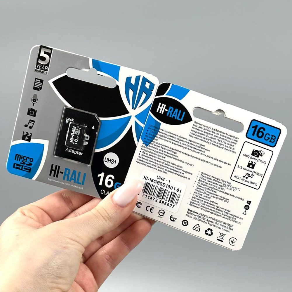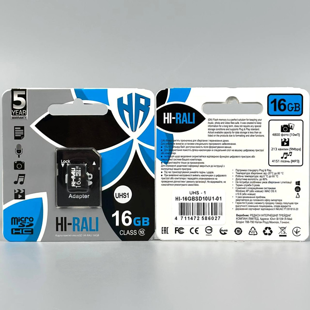 Карта пам'яті Hi-Rali 16Gb (UHS-1) 10 Class (з адаптером SD)