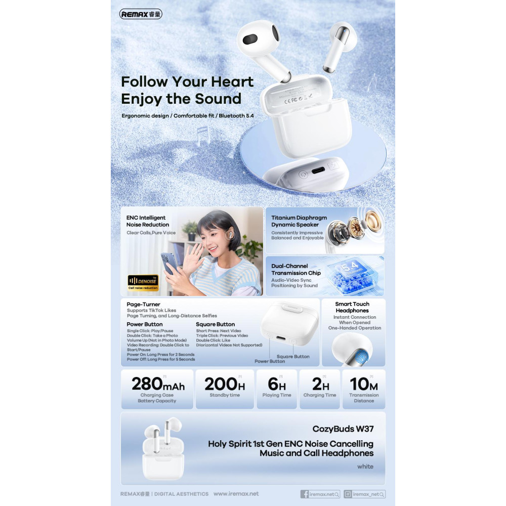 Бездротові навушники Remax W37 Spirit Gen1 ENC Noise Cancelling CozyBuds (Гарантія на перевірку 6 міс.)