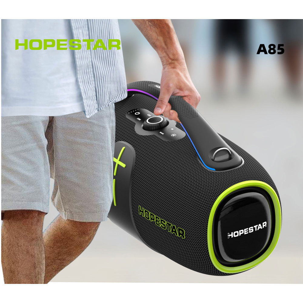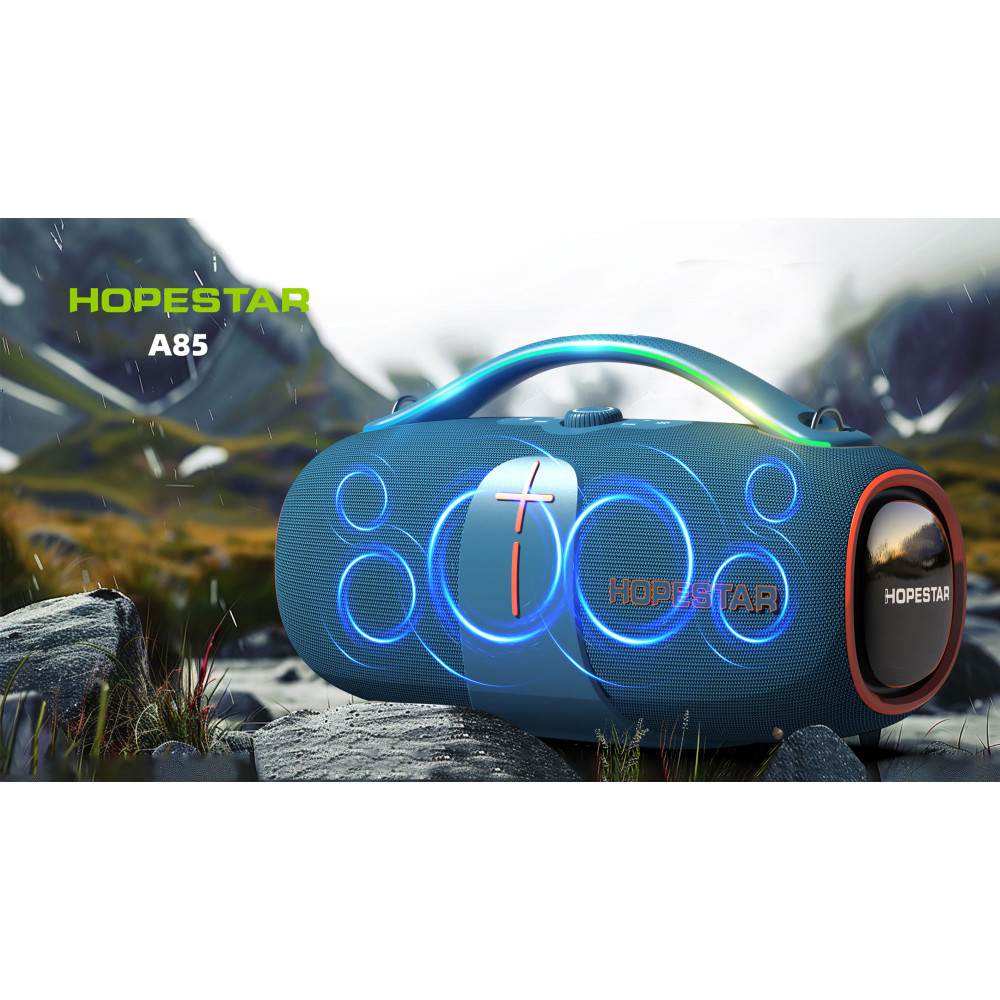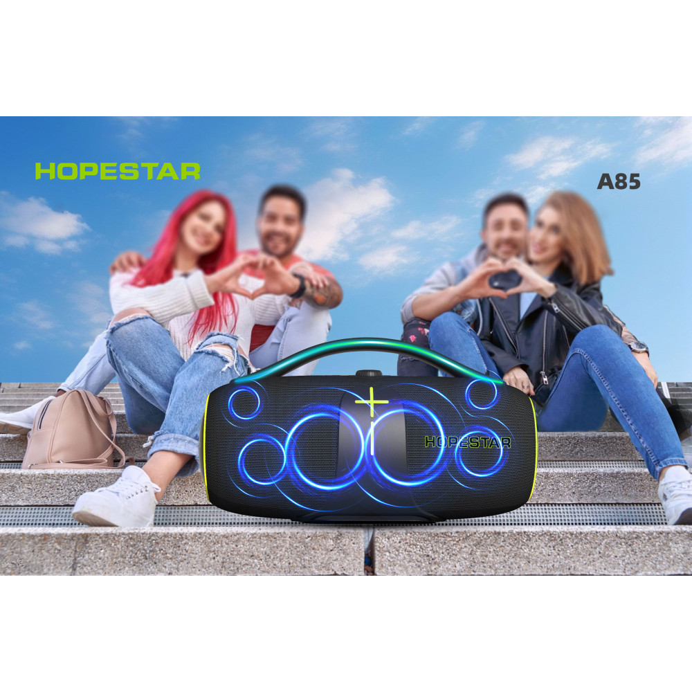 Колонка HOPESTAR A85 оснащена шістьма динаміками різної потужності (два низькочастотних по 100 Вт, два середньочастотних по 60 Вт та два високочастотних по 40 Вт), що забезпечує насичений звук із глибокими басами у всьому діапазоні частот від 80 Гц до 20 кГц. Завдяки знімному акумулятору ємністю 30 000 mAh, пристрій може працювати автономно до 6-8 годин безперервного відтворення музики.