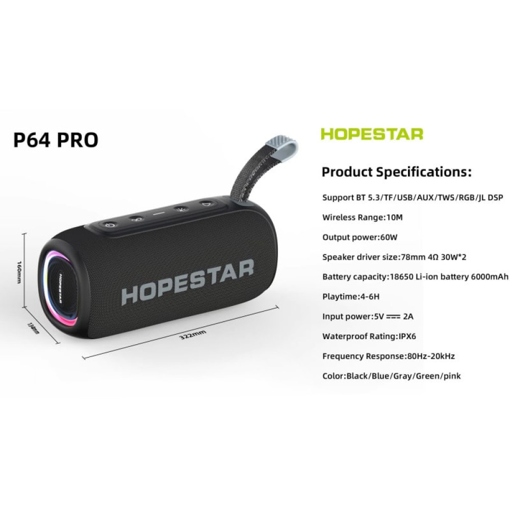 Колонка HOPESTAR P64 Pro RGB 60W, 6000mAh (32,2*13,4*16,0 см) (Гарантія на перевірку 3 міс.)