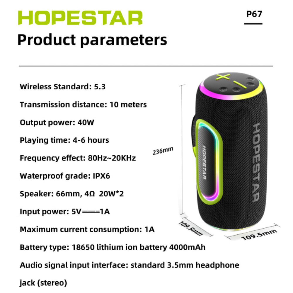 Колонка HOPESTAR P67 RGB 40W, 4000mAh (23,6*10,95*10,95 см) (Гарантія на перевірку 3 міс.)