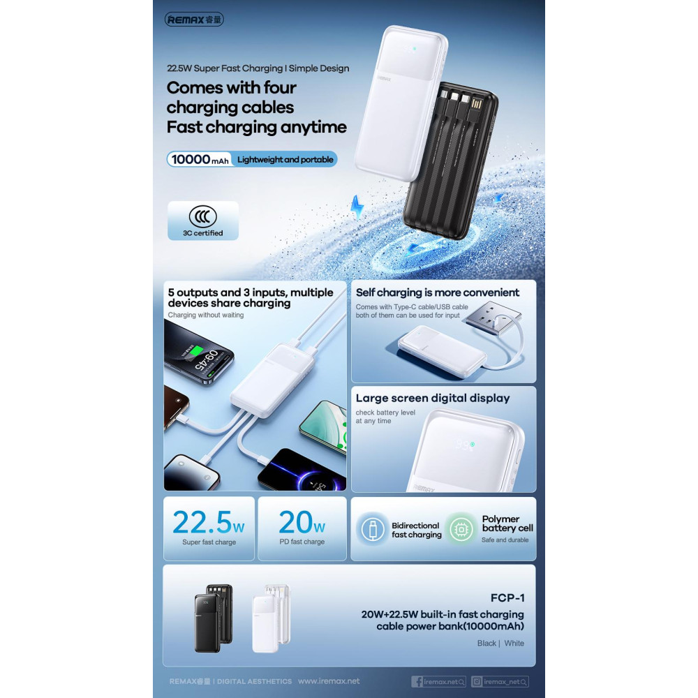 УМБ Power Bank Remax FCP-1 10000mAh PD20W+QC3.0 (with cable Type-C+Lightning+Micro+USB) (Гарантія на перевірку 6 міс.)