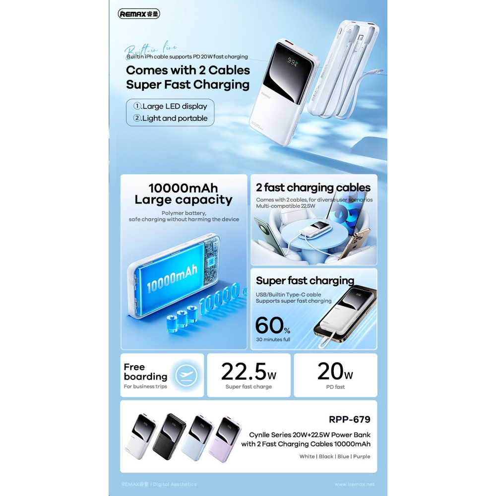 УМБ Power Bank Remax RPP-679 Cynlle 10000mAh PD20W+Q.C22.5W (with cable Type-C+Lightning) (Гарантія на перевірку 6 міс.)