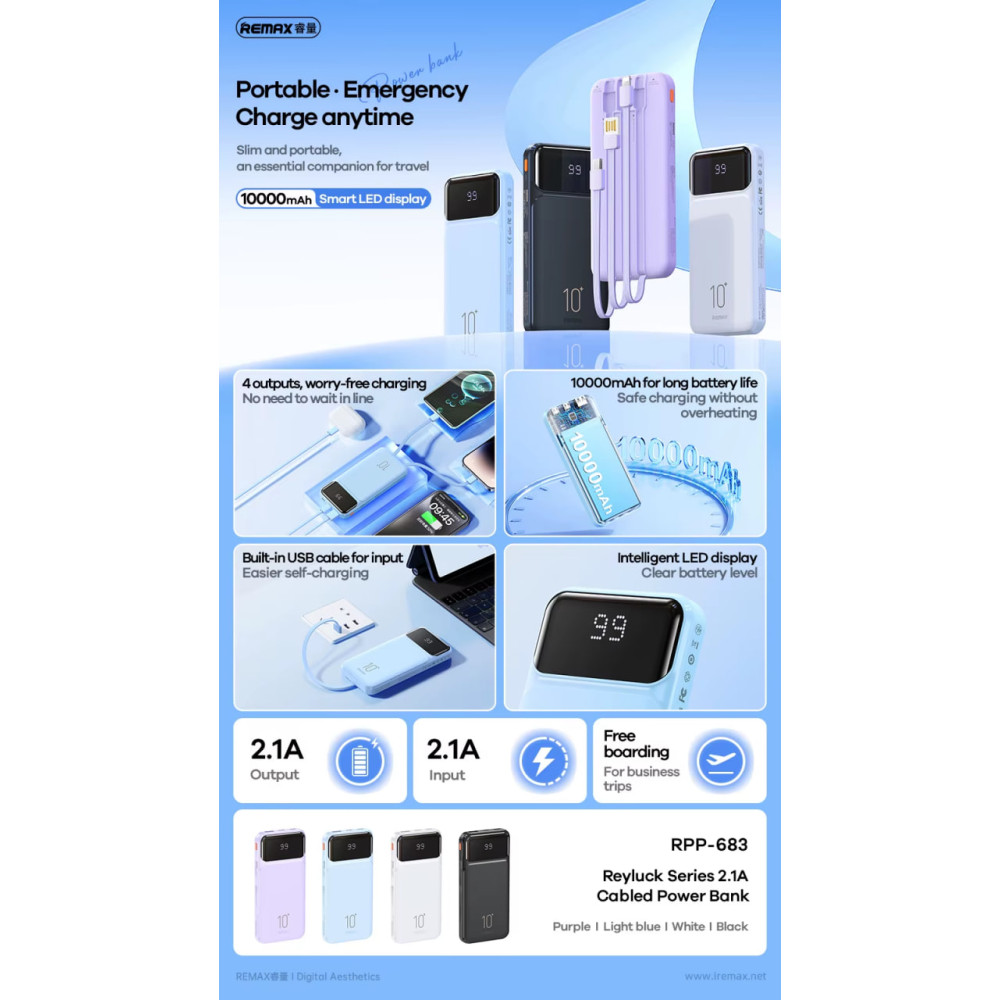 УМБ Power Bank Remax RPP-683 Reyluck Series 10000mAh 2.1A (with cable Type-C+Lightning+USB) (Гарантія на перевірку 6 міс.)