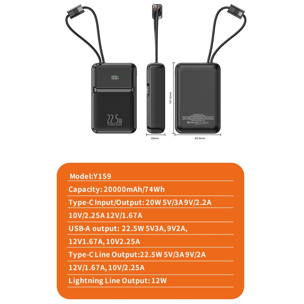 УМБ Power Bank WUW Y159 20000mAh PD20W+22.5W (with cable Type-C+Lightning) (Гарантія на перевірку 6 міс.)