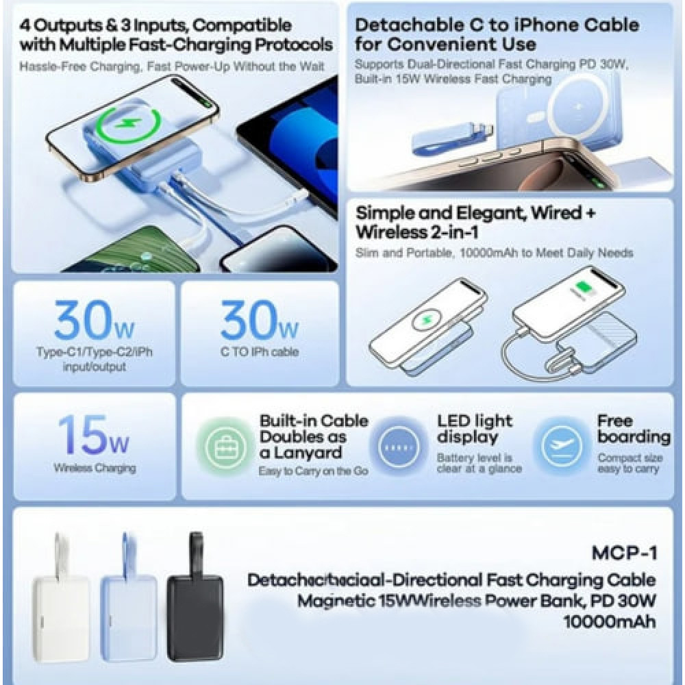 УМБ Power Bank Remax MCP-1 Removable 10000mAh PD30W з бездротовою зарядкою (with cable Type-C+Lightning) (Гарантія на перевірку 6 міс.)