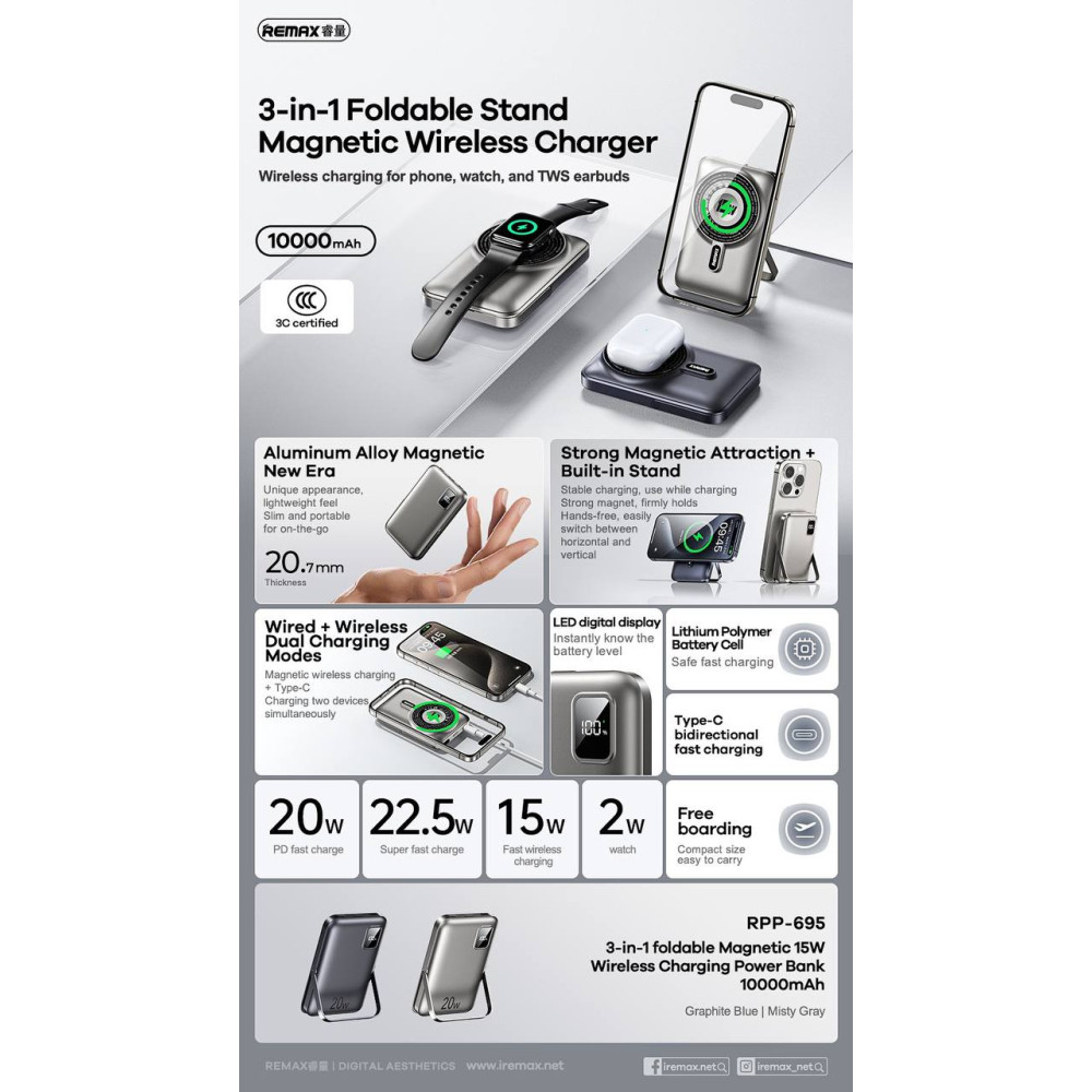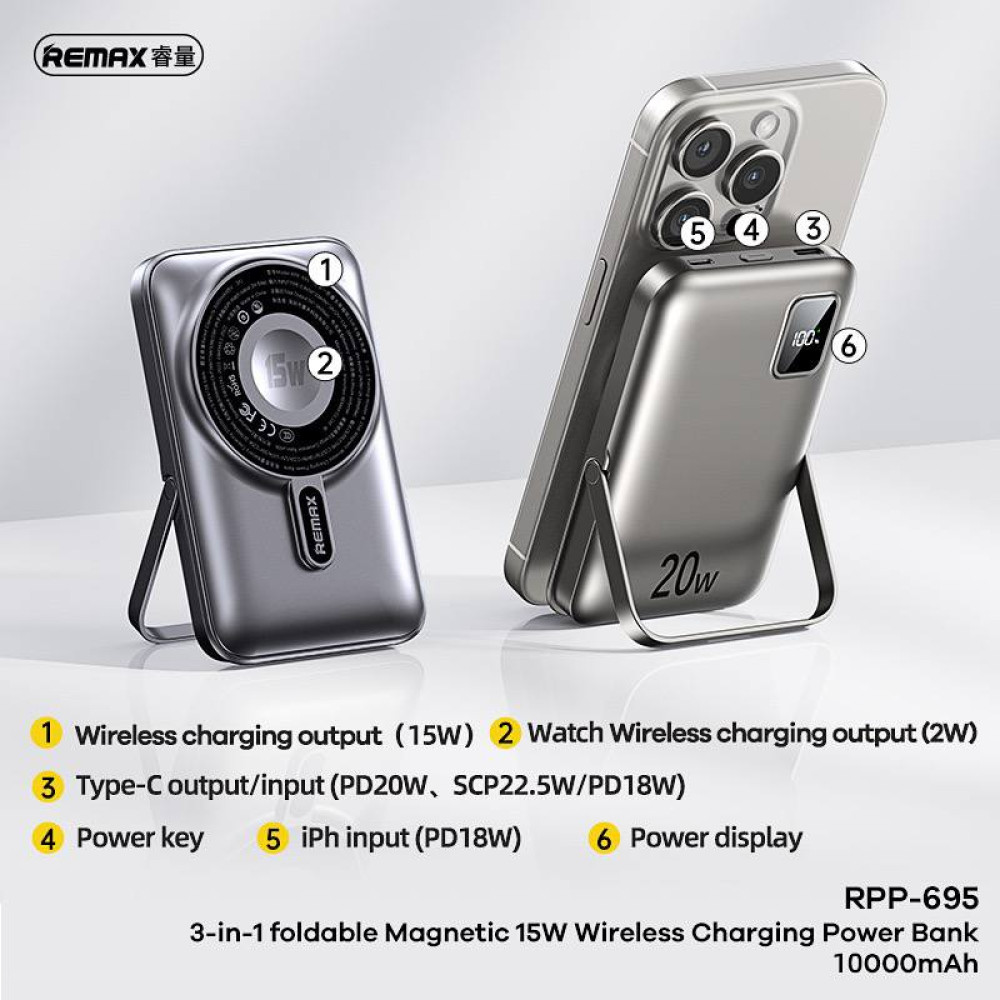 УМБ Power Bank Remax RPP-695 10000mAh PD20W+22.5W з бездротовою зарядкою та підставкою (Гарантія на перевірку 6 міс.)