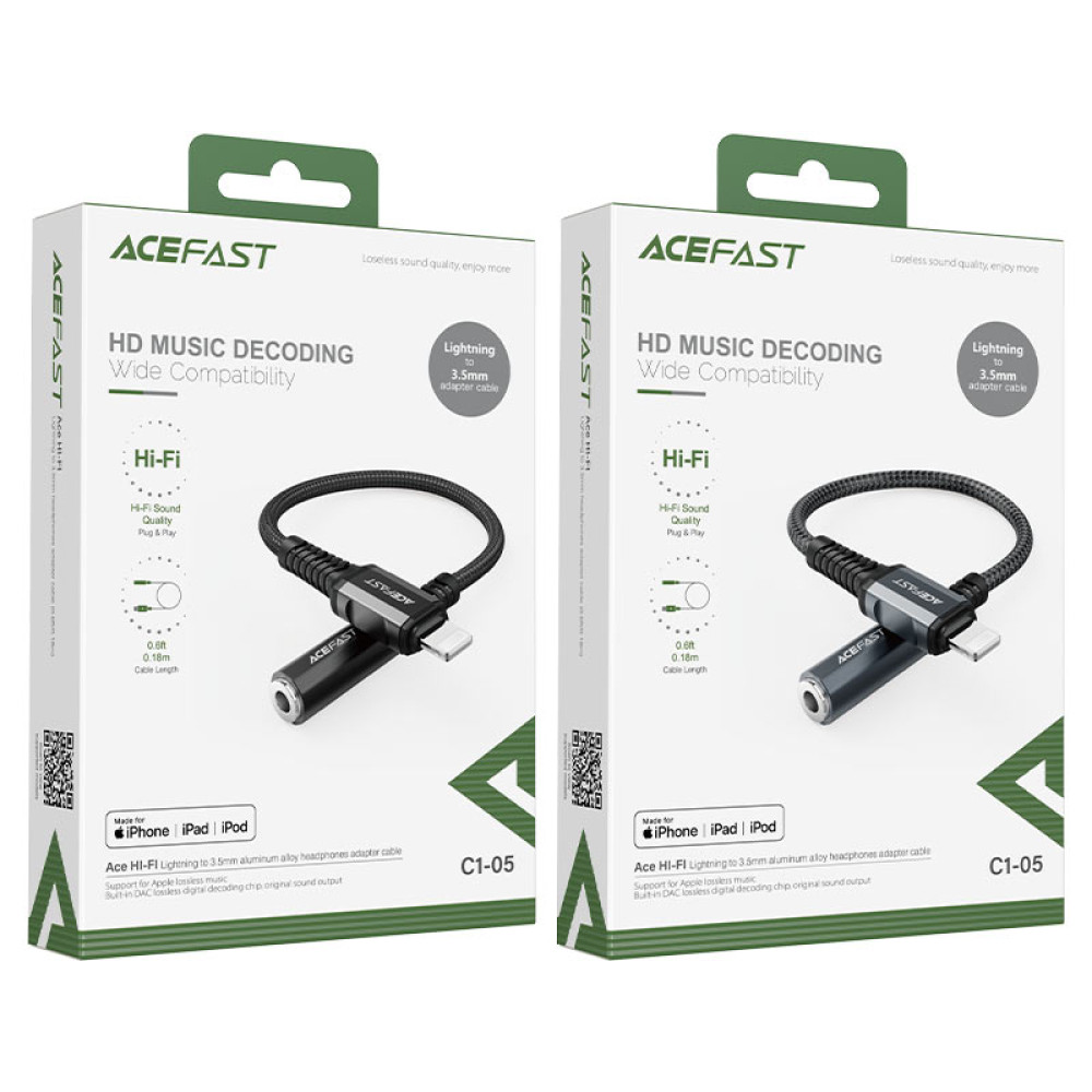 ACEFAST C1-05 — адаптер, що дозволяє підключати навушники з мініджеком 3,5 мм до порту Lightning. Призначений для iPhone та iPad, які не мають роз’єму для навушників. Має сертифікат MFI (Made For iPhone), тому на телефоні не відображатиметься повідомлення про неоригінальний аксесуар.