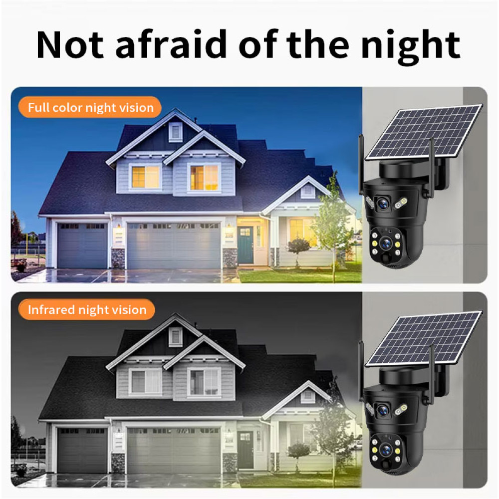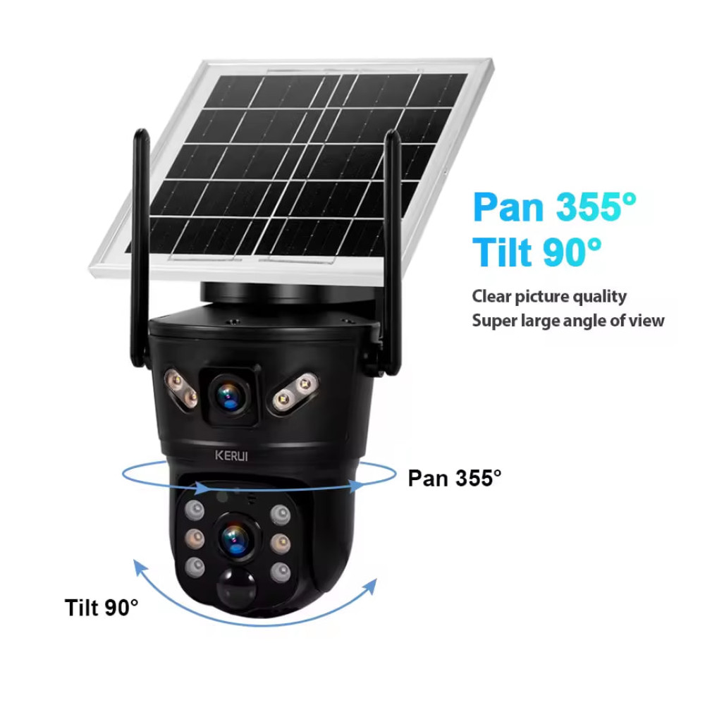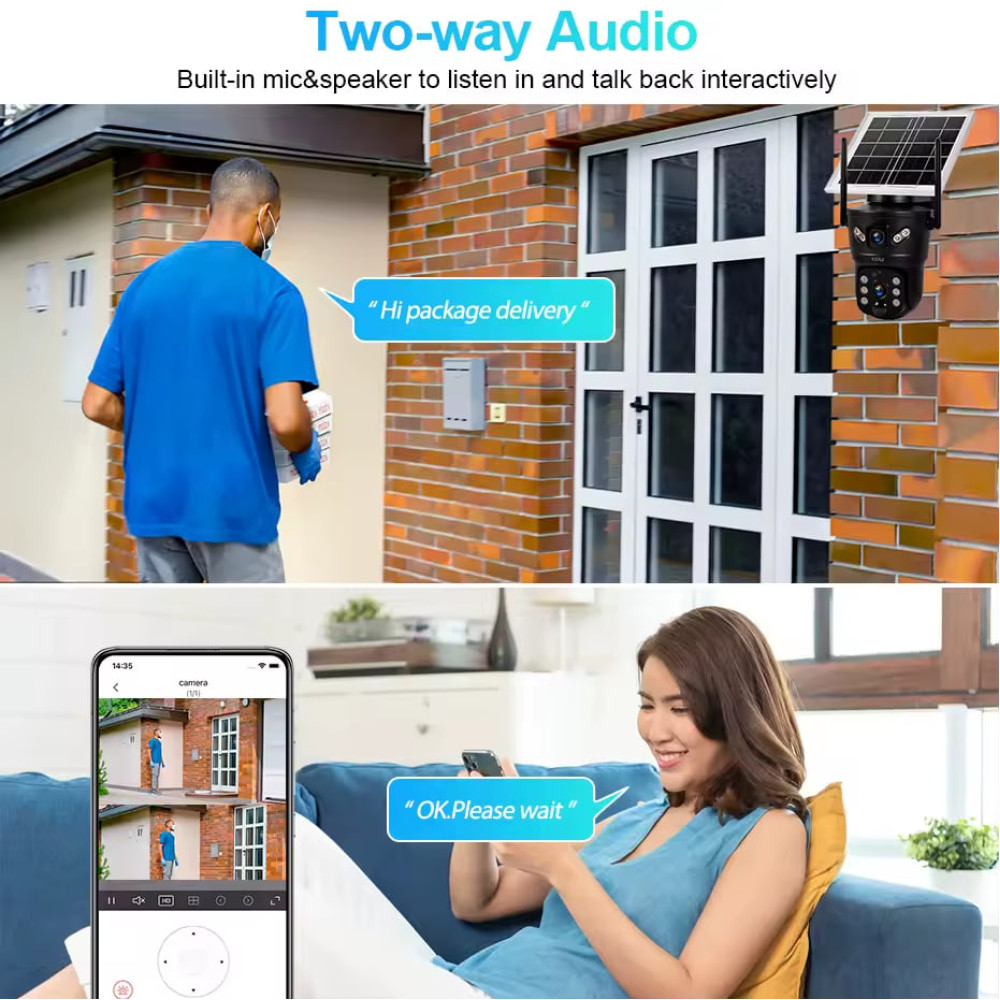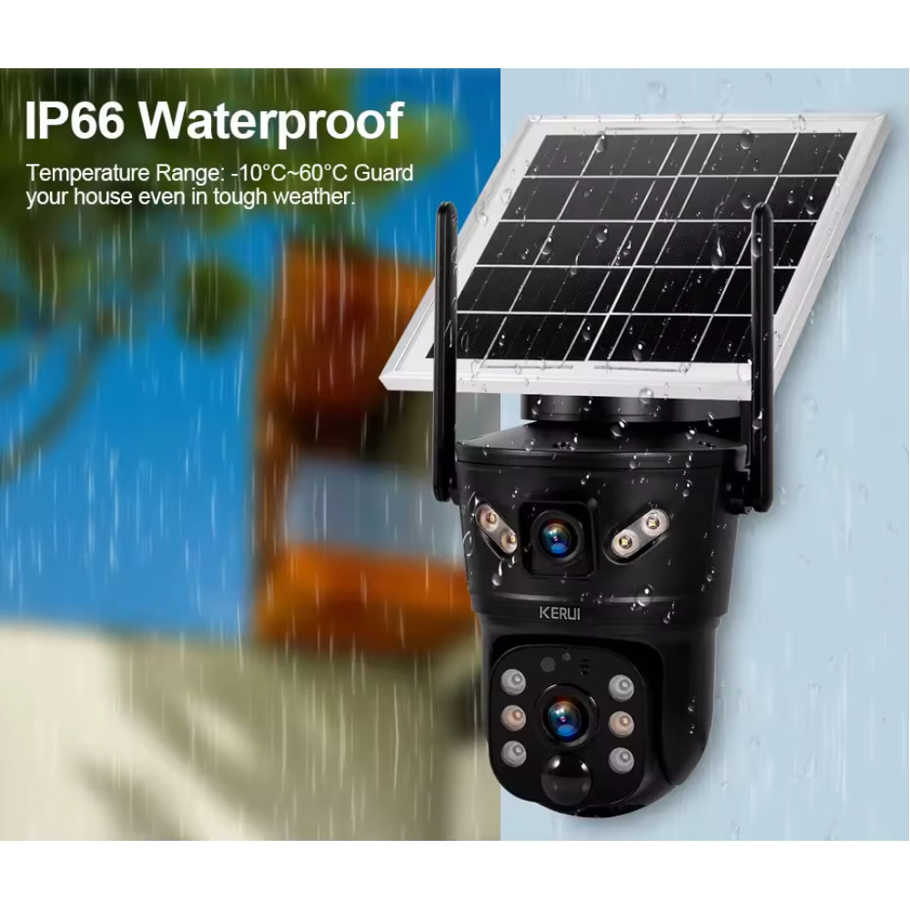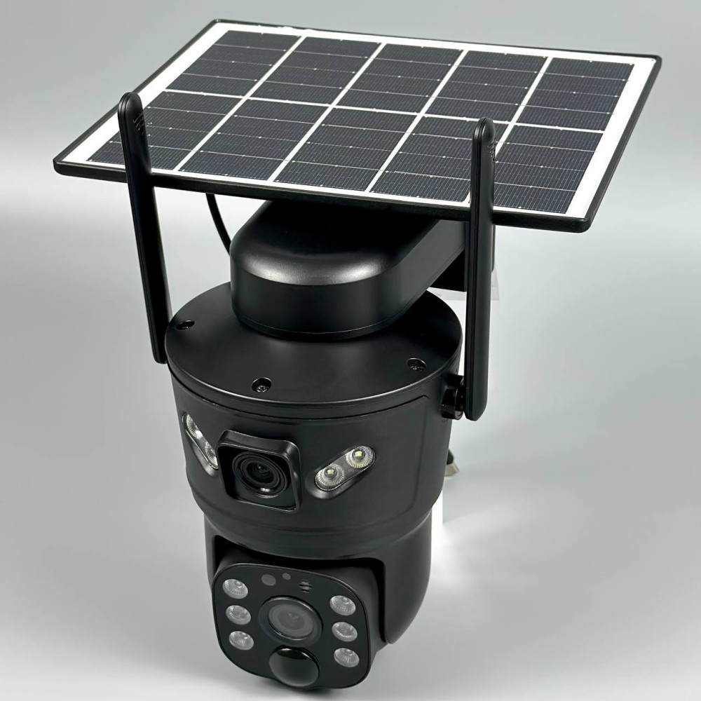 Повна автономність забезпечується вбудованими акумуляторами та високоефективною сонячною панеллю, яка автоматично заряджає батареї протягом дня, гарантуючи роботу 24/7. Камера оснащена інтелектуальними функціями: двостороннім аудіозв'язком (вбудований мікрофон та динамік), кольоровим нічним баченням та AI-виявленням руху з автоматичним відстеженням об'єктів. Корпус має ступінь захисту від вологи та пилу IP66.