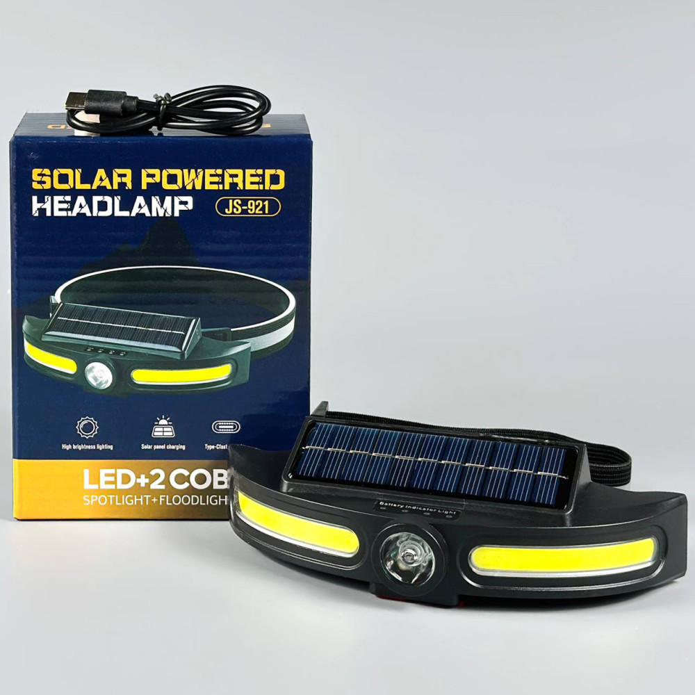 Ліхтар налобний JS-921 (з акумулятором, сонячною панеллю, 4-ма режимами світла, Type-C) (Гарантія на перевірку 1 міс.)