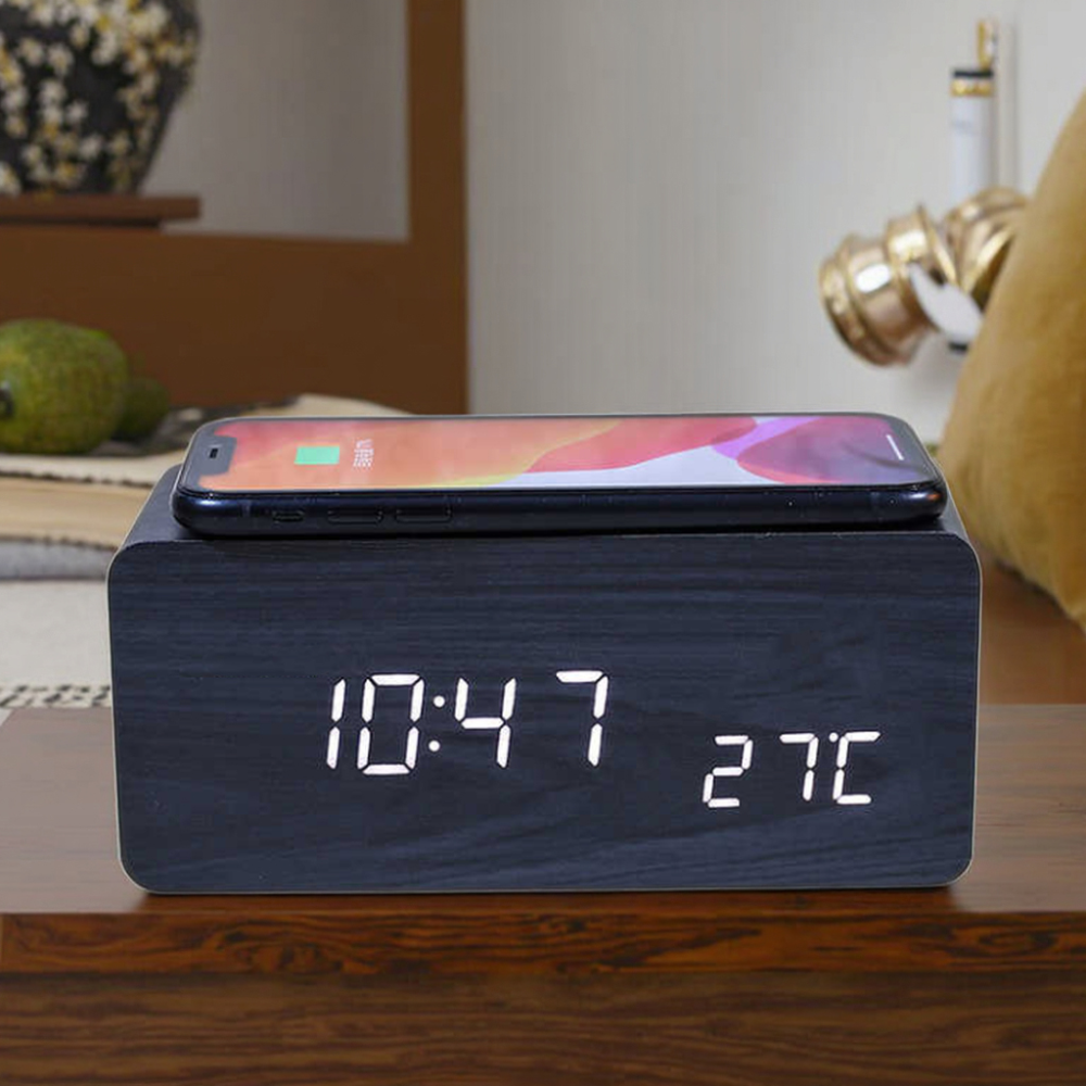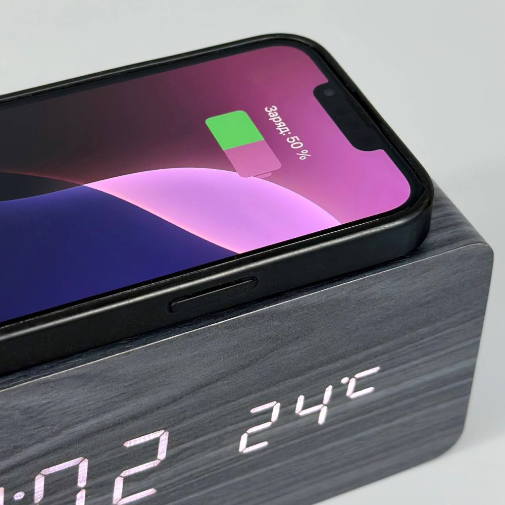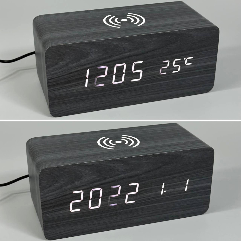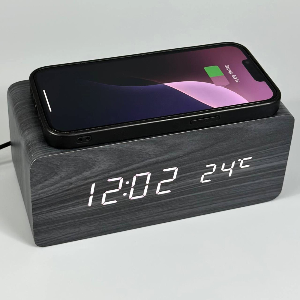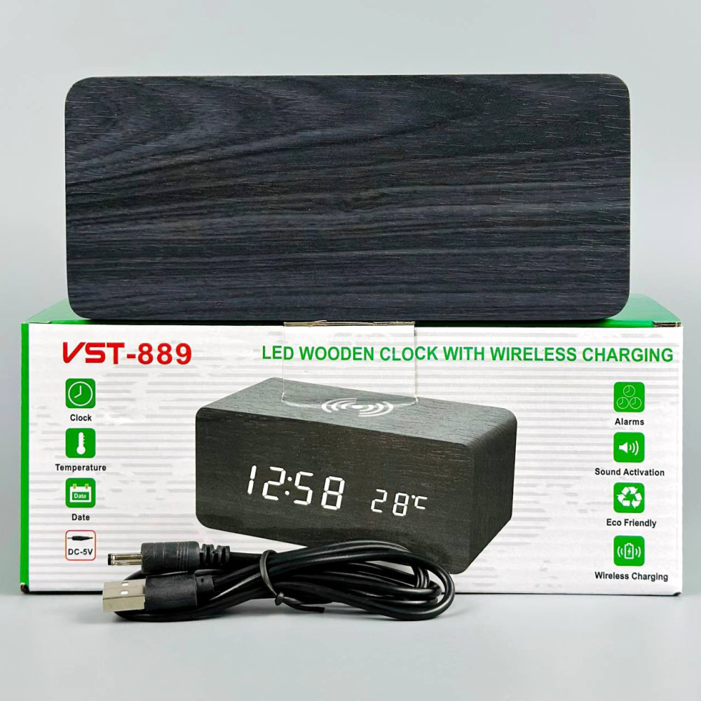 Настільний годинник VST-889-6 (біла підсвітка, дата, будильник, голосовий контроль, бездротова зарядка, DC-5V, 4хАAA) (Гарантія на перевірку 1 міс.)