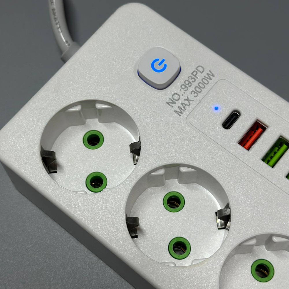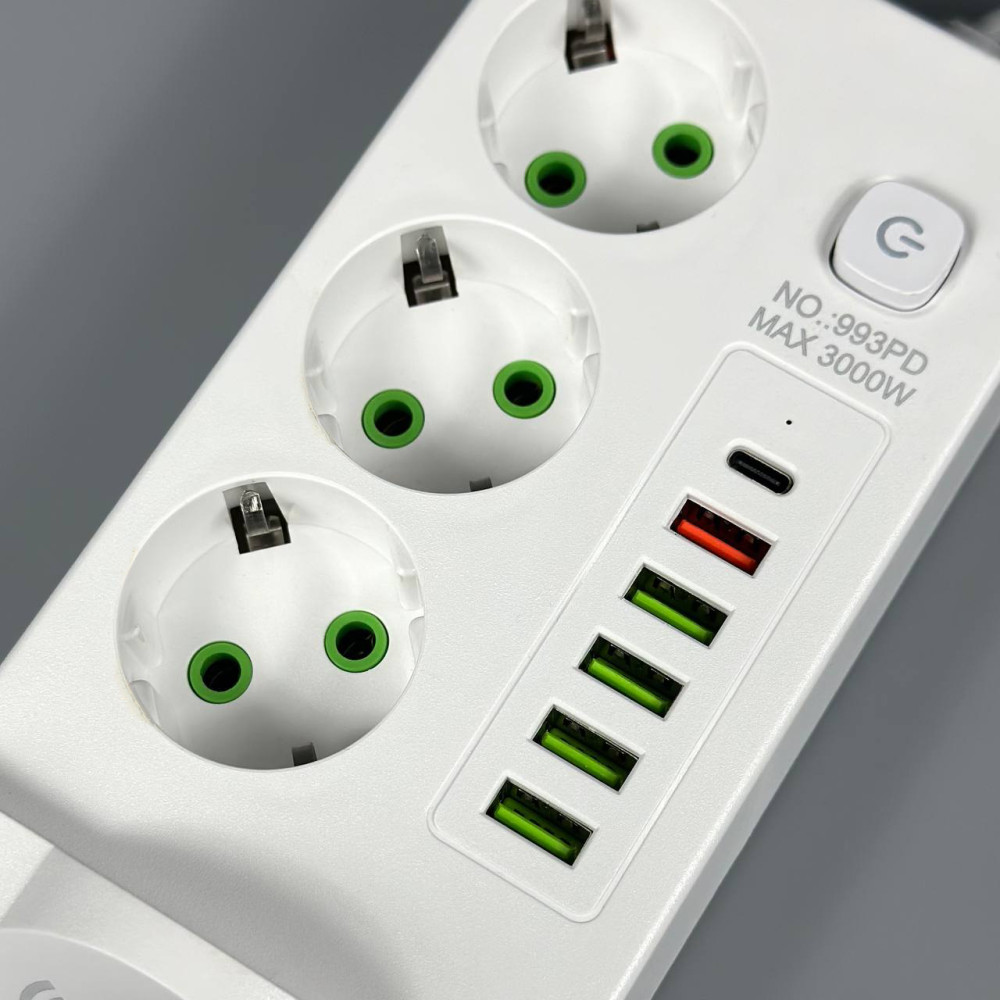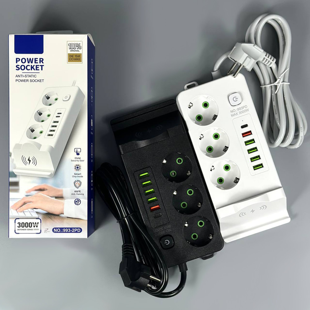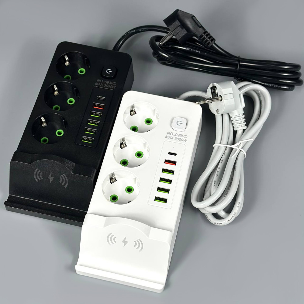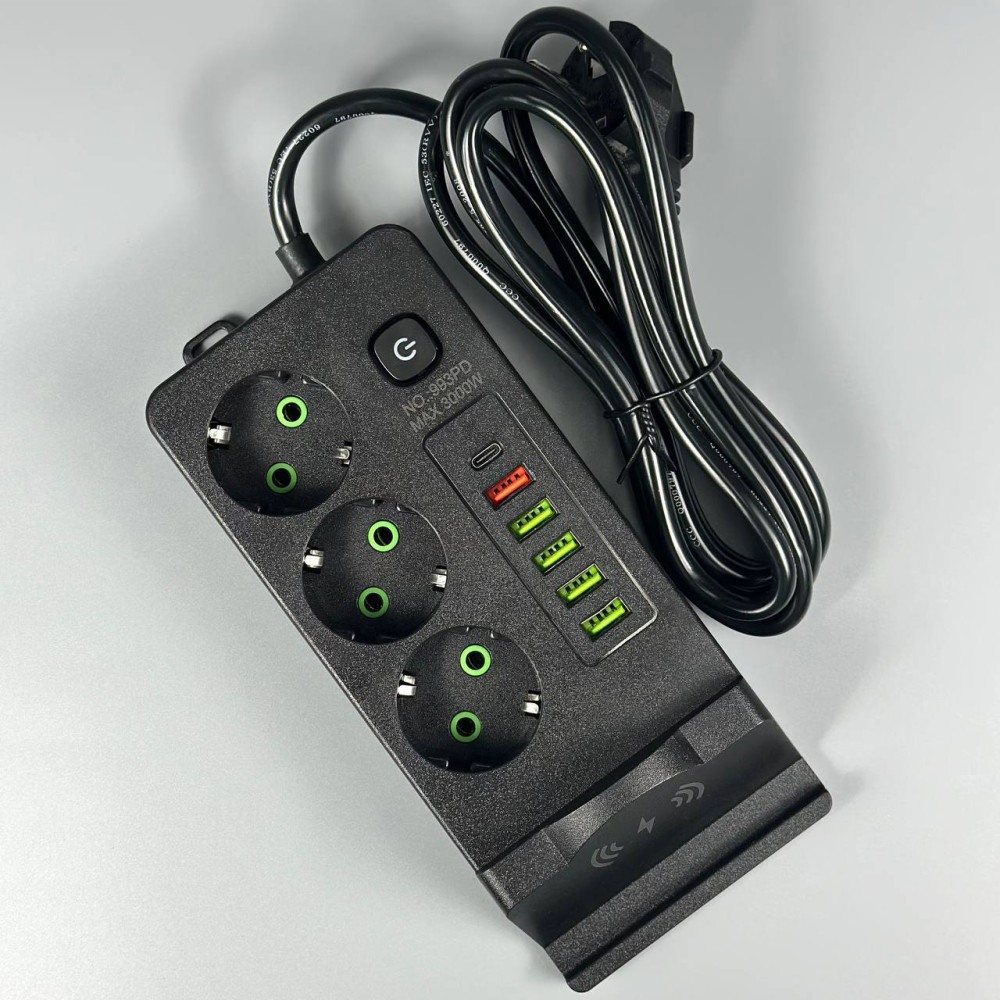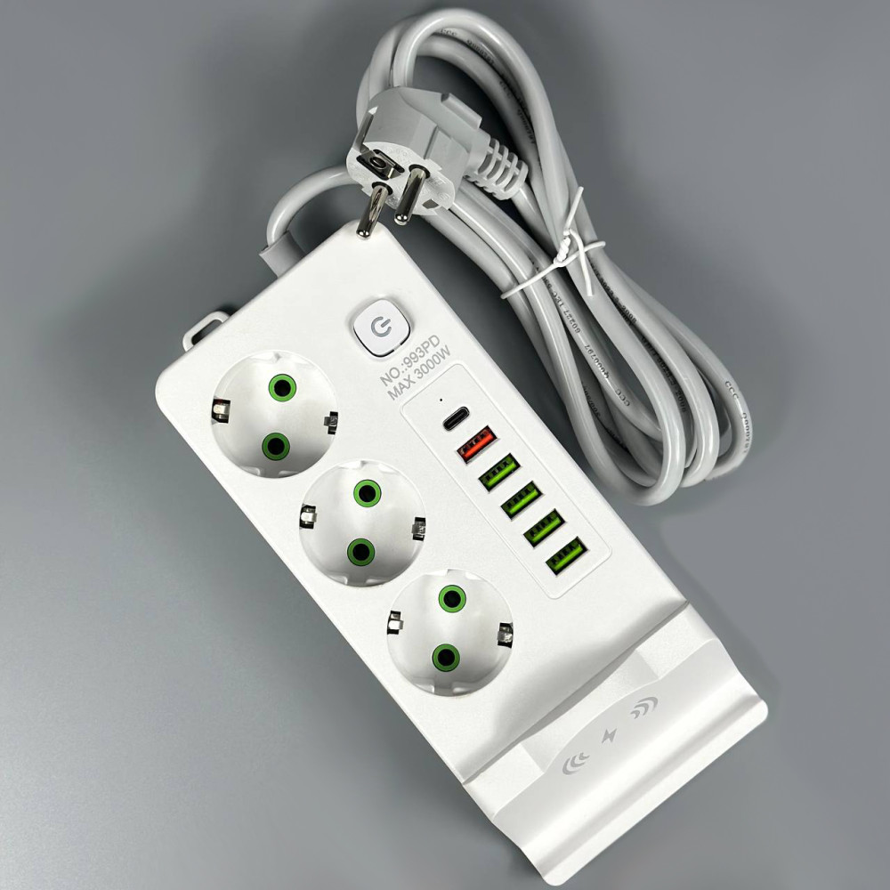Мережевий подовжувач (з бездротовою зарядкою) Power Socket 993PD 5USB+Type-C 3 розетки 3000W 2m (Гарантія на перевірку 3 міс.)