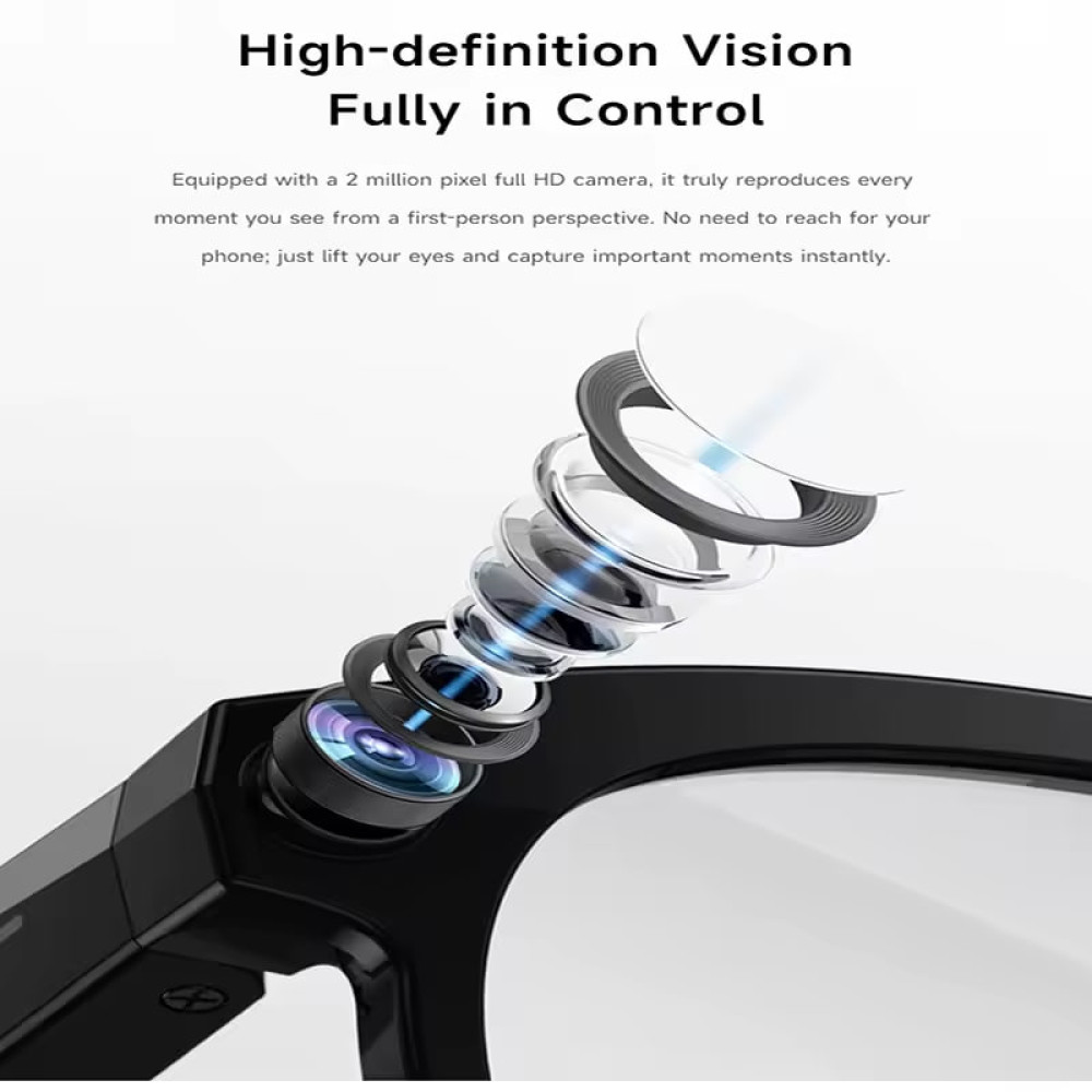 Смарт-окуляри Smart AI Glasses 2MP — це стильний та зручний гаджет, який поєднує сучасний дизайн, функціональність і новітні технології. Пристрій оснащений 2-мегапіксельною камерою, що дозволяє знімати якісне HD-відео та фото з точки зору користувача — ідеально для подорожей, спорту, влогів чи щоденного використання.