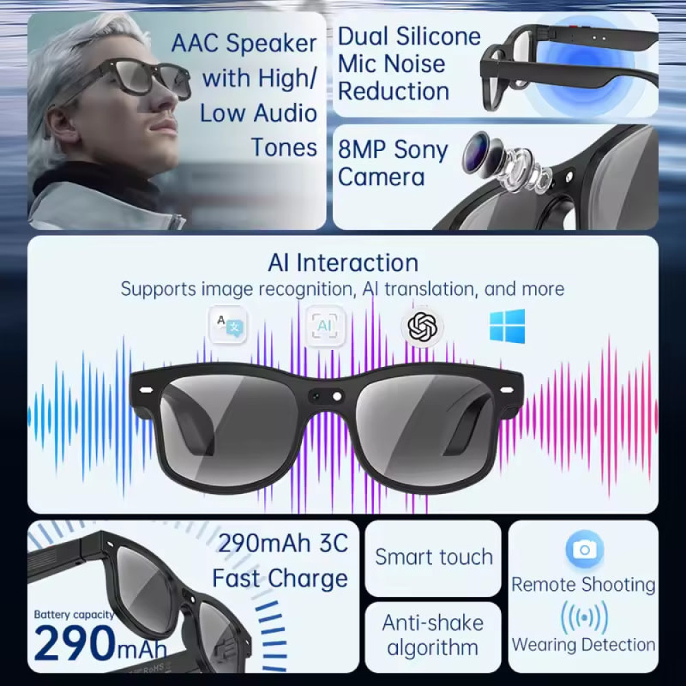 Смарт-окуляри AIMB-G3 — це інноваційний гаджет нового покоління, який поєднує стиль, технології та зручність. Оснащені 8MP-камерою, ці окуляри дозволяють знімати фото та відео високої якості прямо з вашої точки зору — ідеально для влогів, подорожей, спорту чи роботи.