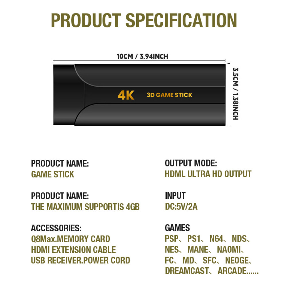 Q8Max — це високотехнологічне мультимедійне рішення в сегменті портативних ігрових приставок. Модель призначена для відтворення ретро-ігор та сучасних 3D-симуляторів у високій роздільній здатності. Завдяки компактному форм-фактору (HDMI-stick) та стабільній апаратній частині.