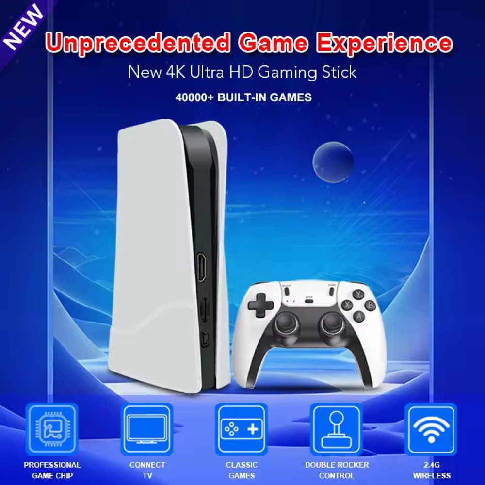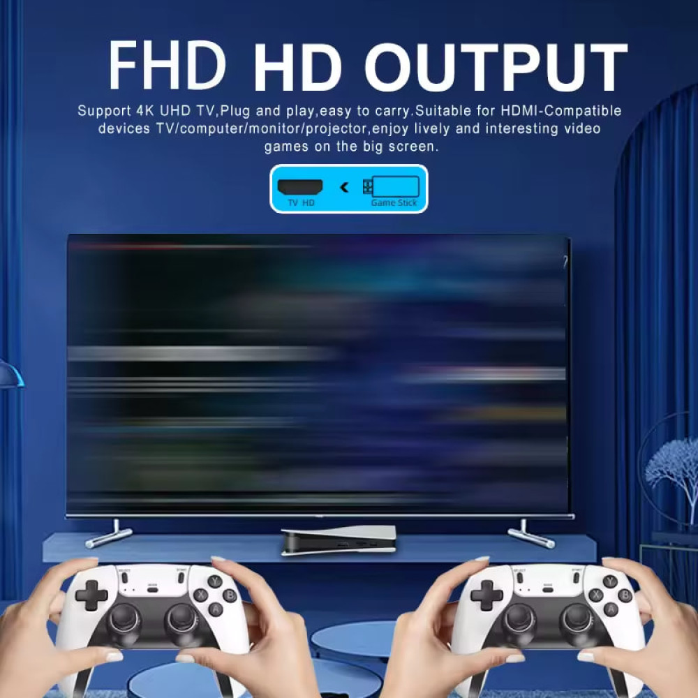 У комплекті йдуть 2 бездротові геймпади 2.4G, тому можна одразу грати удвох без зайвих кабелів. Консоль працює за принципом Plug & Play — достатньо підключити її до телевізора та живлення, після чого ви отримаєте доступ до великої бібліотеки ігор.