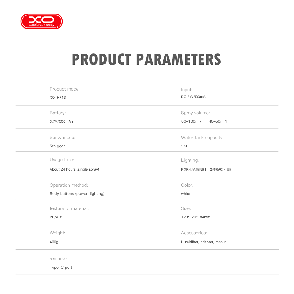 Зволожувач повітря XO HF13 400mAh (подвійний режим розпилення, RGB підсвітка, 1.5L)