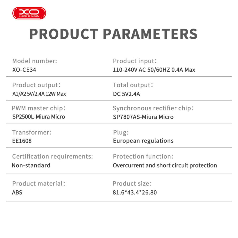 Мережевий зарядний пристрій XO CE34 2.4A